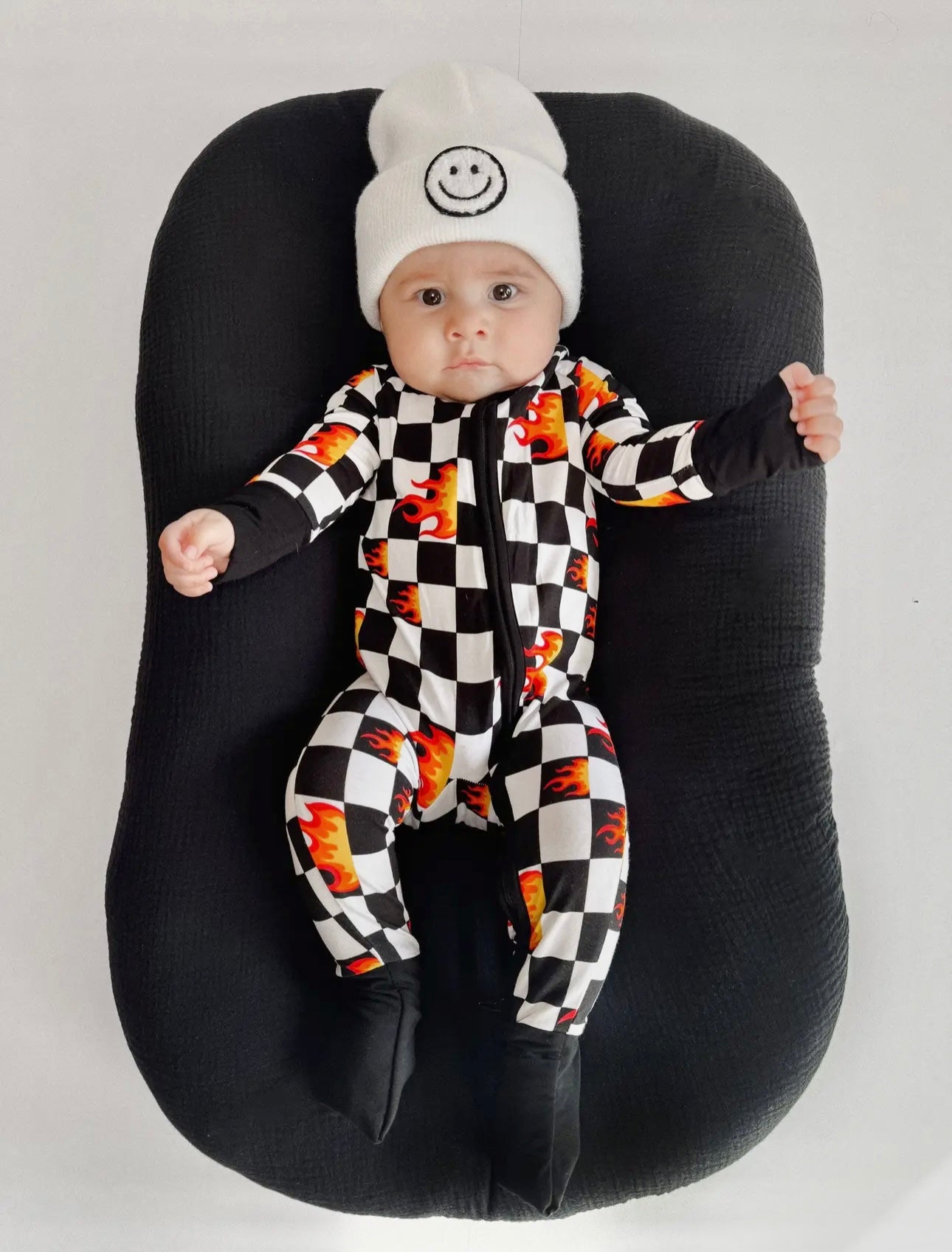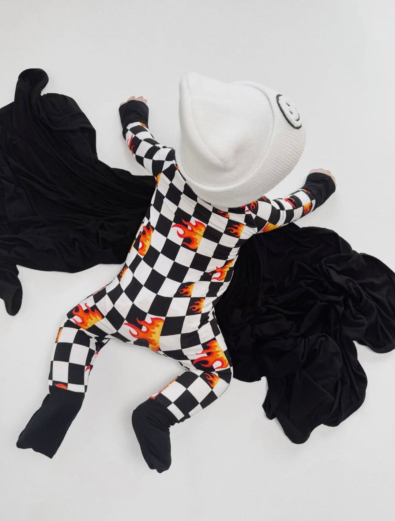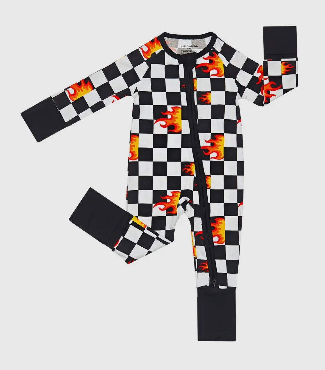 The Bamboo Zip Romper | Checker Blaze is made for little racers with big personality. Featuring a bold black-and-white checkered pattern with bright orange flames, this bamboo baby romper brings high-speed style to everyday comfort. Crafted from buttery soft, breathable bamboo fabric, it’s perfect for playtime, naps, and every little victory lap in between.