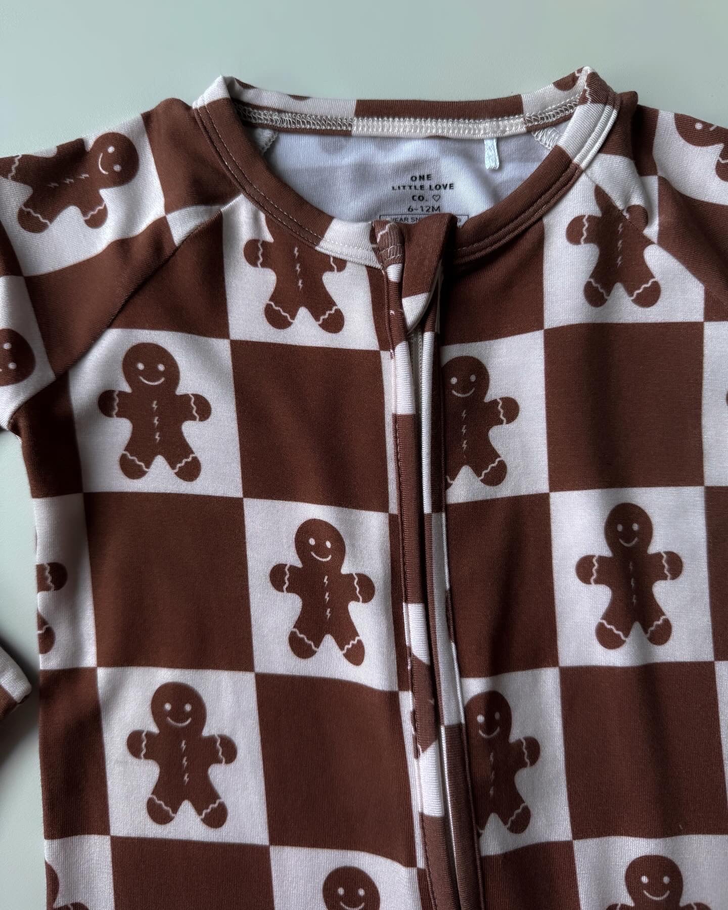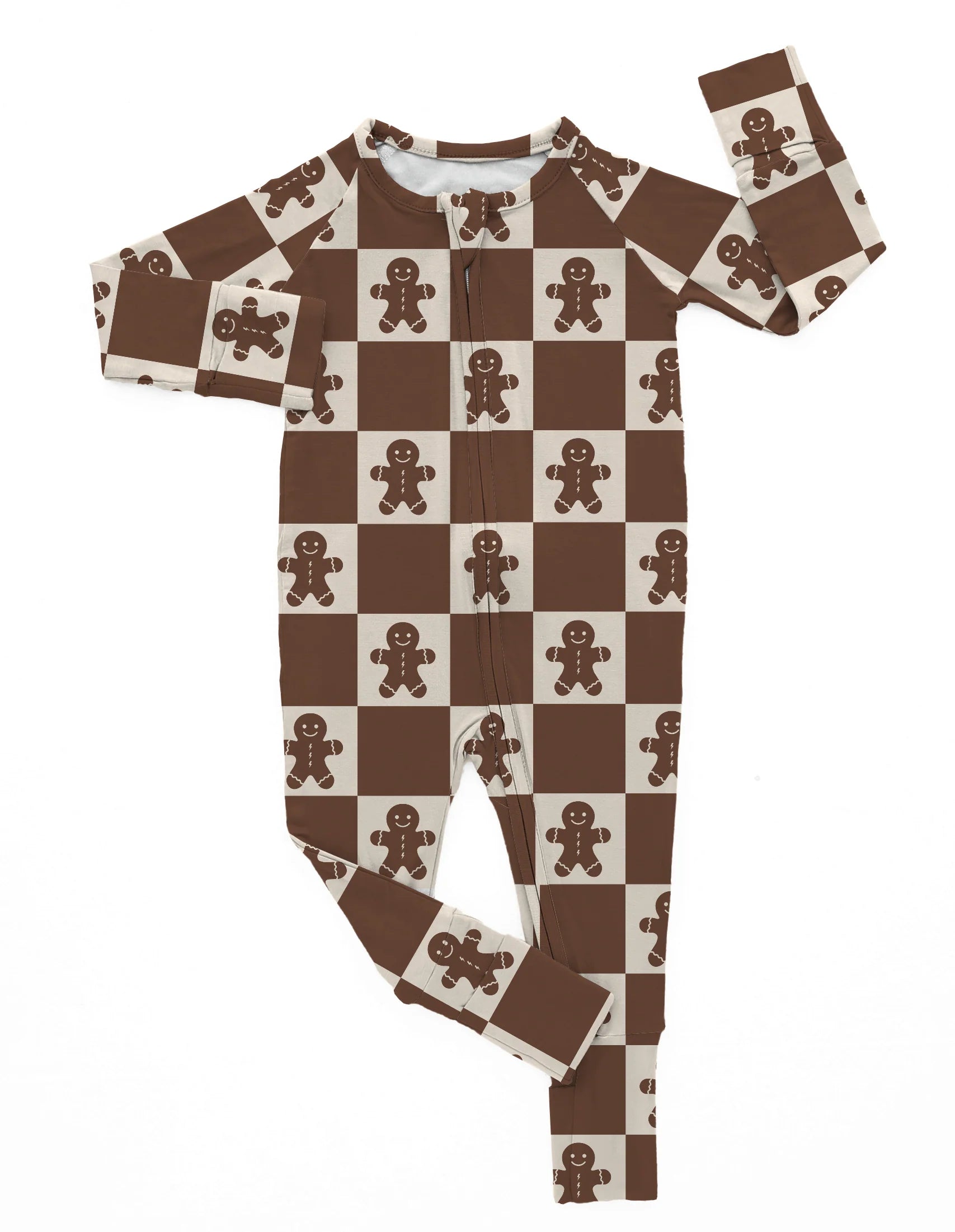 These adorable, brown Gingerbread checkered pajamas are 95% bamboo and 5% Spandex